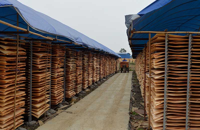 2:裁切和旋切以后的木層都含有比較大的水分,因此,大規(guī)模的生產(chǎn)我們要通過木材烘干機(jī)進(jìn)行烘干處理,烘干后的木層比較脆,因此,要自然放置2-3天,可以保證木層的韌性。怪獸木業(yè)單板晾曬干燥i,擁有百畝晾曬單板的場地。
