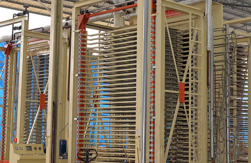 6:熱壓成型處理:經(jīng)過涂膠鋪設(shè)好的模板層,通過熱壓工藝進(jìn)行壓平。傳統(tǒng)的加熱時采用了鍋爐水傳到熱進(jìn)行加熱,現(xiàn)代化設(shè)備室采用了電加熱,壓平后,可以增加建筑模板的密實(shí)度,成型比較規(guī)則,提高了模板的使用質(zhì)量。采用先預(yù)壓再熱壓的工藝,大程度降低坯板錯位的幾率,再施以合理的壓力和溫度熱壓,保證了每一張建筑模板均有好的膠合強(qiáng)度和硬度。